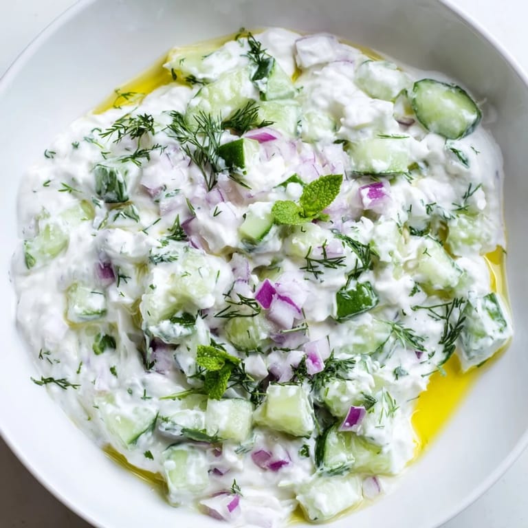 Save I threw this together on a sweltering afternoon when the thought of turning on the stove made me want to lie on the kitchen floor. My neighbor had dropped off a bag of cucumbers from her garden, and I had a tub of Greek yogurt about to expire. I remembered my aunt making something similar years ago, minus the measurements, so I just started chopping and tasting until it felt right. The garlic hit sharper than I expected, the dill smelled like summer, and within minutes I had a bowl of something cold, creamy, and exactly what I needed. I ate half of it standing at the counter before I even thought to plate it properly.