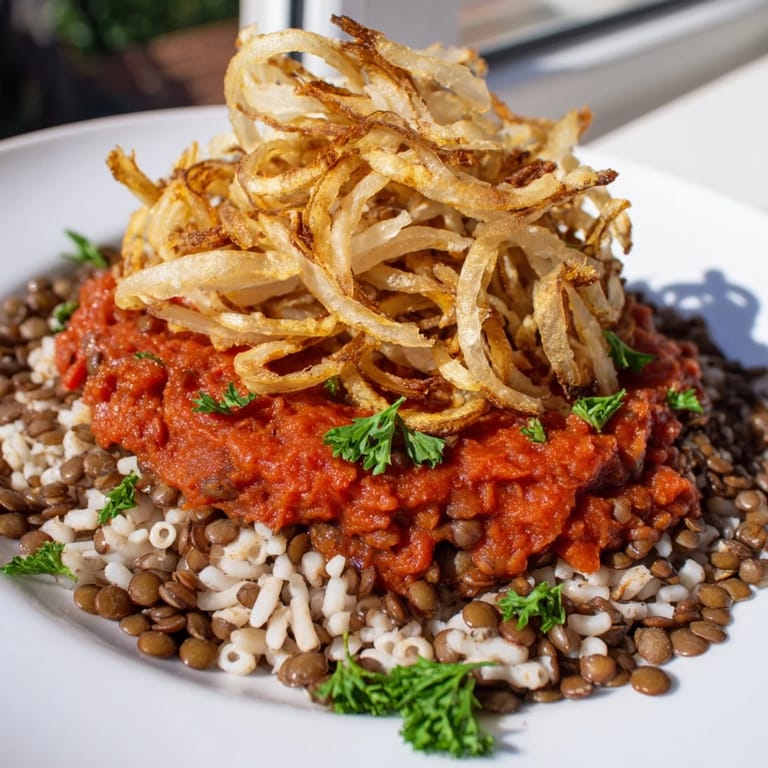 Save The first time I tasted koshari, I was standing at a cramped Cairo street stall at dusk, watching a vendor expertly layer rice, lentils, and pasta into a paper cone with the precision of someone who'd done it ten thousand times. The aroma of cumin and fried onions hit me before I even took a bite, and I remember thinking this couldn't possibly work—how could something so humble and mismatched be so utterly perfect? Now whenever I make it at home, I chase that exact feeling of discovering something that shouldn't be delicious but absolutely is.