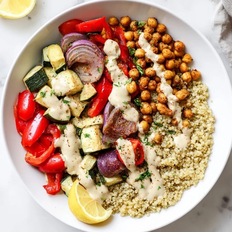 Save A vibrant, wholesome grain bowl featuring roasted vegetables, chickpeas, and a tangy lemon-tahini dressing—perfect for a satisfying lunch or light dinner.