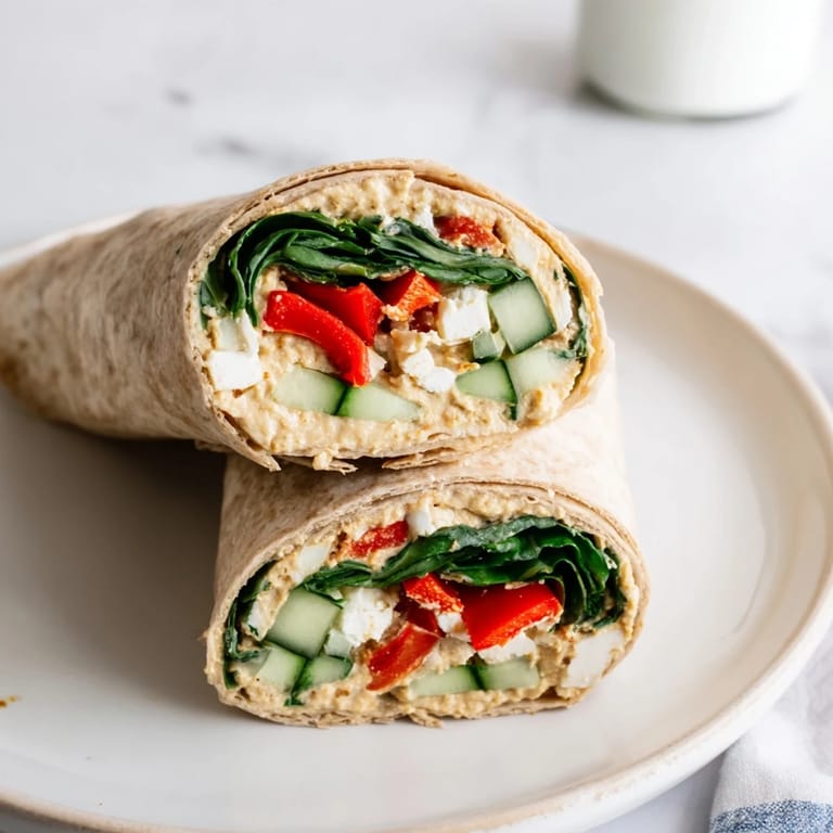 Save I was standing in my kitchen on a Tuesday afternoon, staring into the fridge with zero energy to cook. That's when I spotted the jar of roasted red peppers I'd forgotten about, a tub of hummus, and some wilted spinach that still had life in it. I grabbed a tortilla, smeared everything together, and took a bite standing over the counter. It tasted like I'd ordered it from a cafe, and I've been making these wraps ever since.